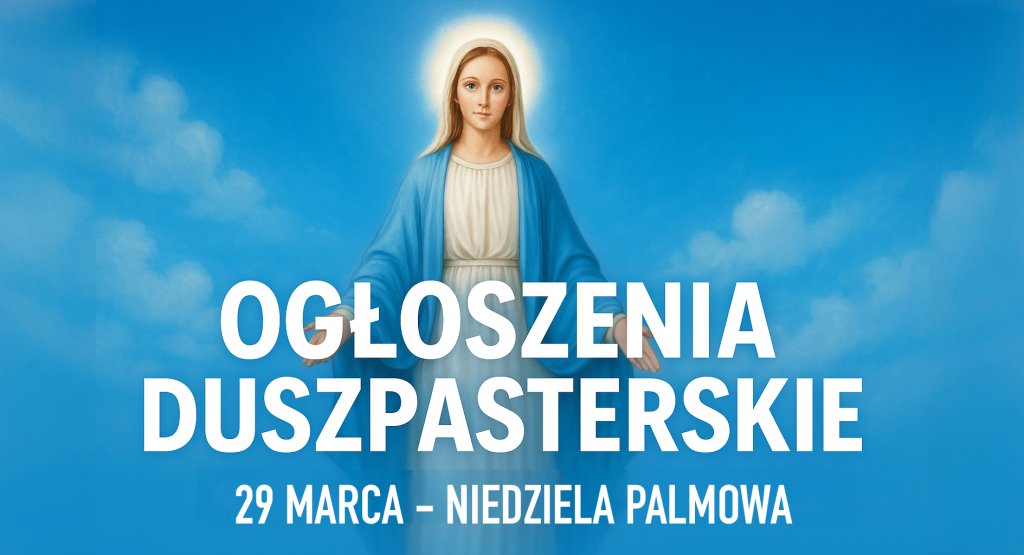 Ogłoszenia Duszpasterskie29 marca 2026 Niedziela Palmowa 1. Niedziela Palmowa W dzisiejszą niedzielę obchodzimy pamiątkę uroczystego wjazdu Jezusa do Jerozolimy, rozpoczynając